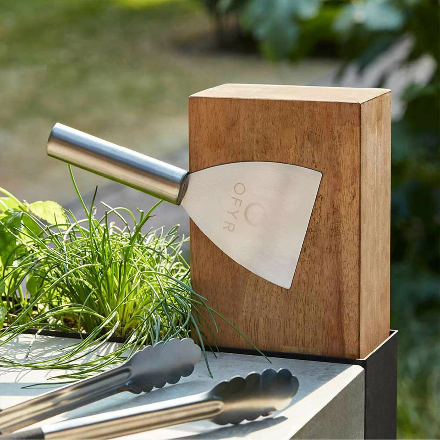 - La plaque OFYR se nettoie facilement grâce au feu central : très pratique, on pousse avec la spatule les résidus alimentaires et les jus de cuisson dans le feu pour les faire brûler. Autre bonne nouvelle, une spatule courte en inox est incluse dans chaque unité de cuisson OFYR ! A peine reçu, lancez les festivités !