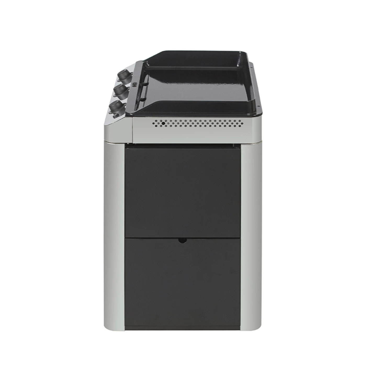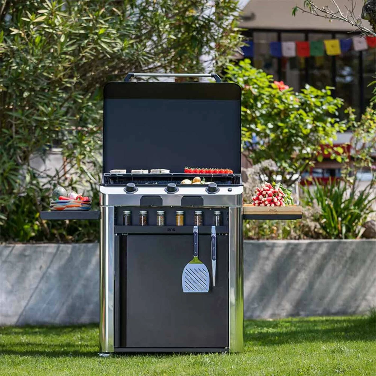 Passez de 2 à 3 brûleurs avec le nouveau combo Fusion 75 ENO en inox marin et acier galvanisé noir. Équipé d’une plancha gaz en fonte émaillée, cette dernière est posée sur un chariot robuste avec 2 tablettes, 1 porte et 1 étagère.