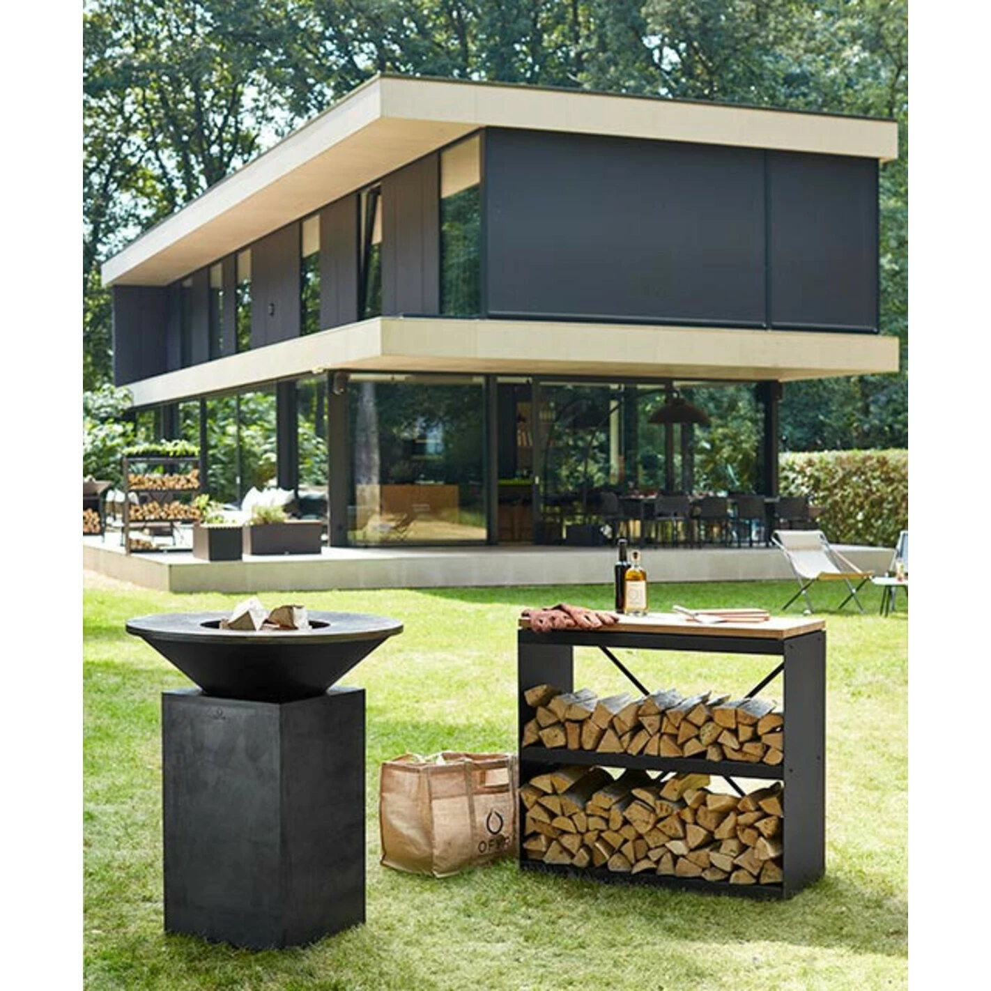 Le range-bois Ofyr en acier laqué noir s’accorde parfaitement avec votre brasero plancha. Avec ses dimensions de L 100 x P 45 x H 94 cm, vous pouvez y stocker jusqu’à 0,3m³ de bois sec sur 2 étagères. Vous disposez ainsi toujours de combustible à proximité de votre outil de cuisson !