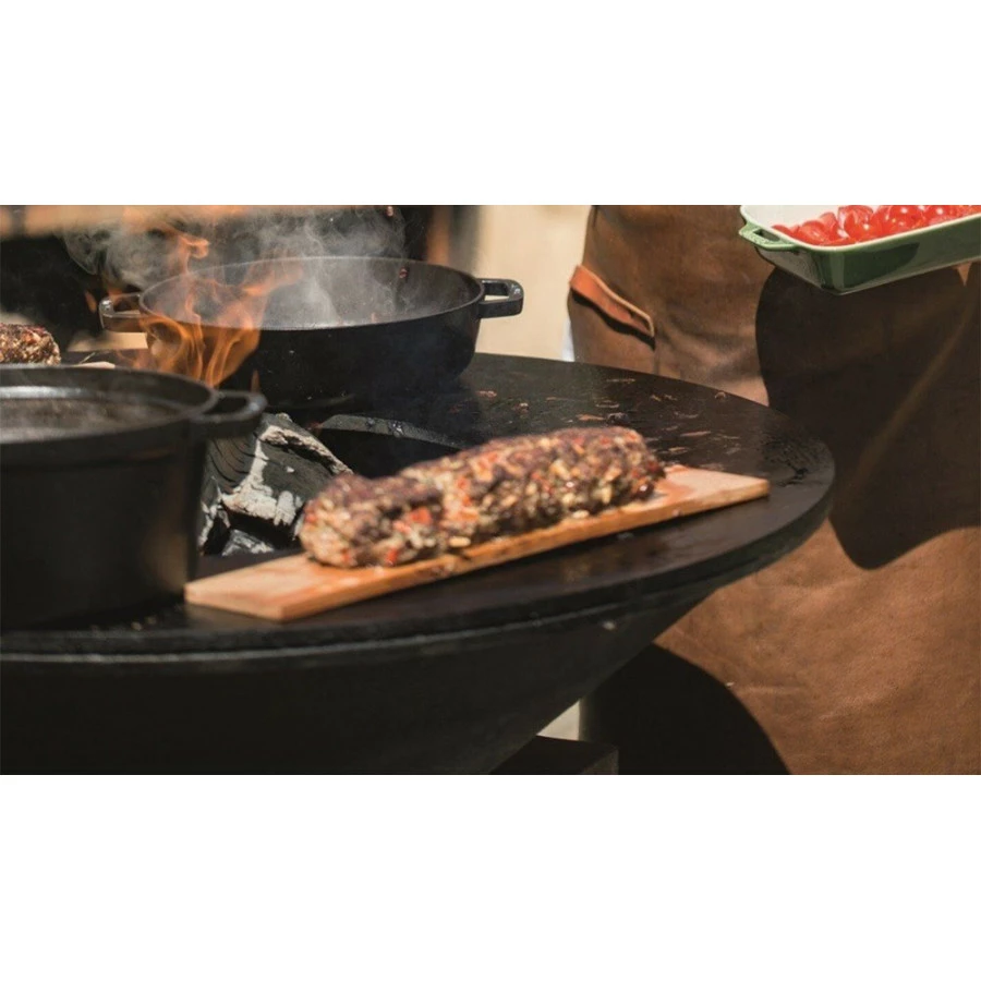 - 1 grille saisie pour Ofyr 100 de Ø49 x H11 cm en acier noir pour un espace de cuisson supplémentaire au centre du brasero. Elle se place par dessus le foyer pour réaliser des cuissons directes à haute température au feu de bois. L’accessoire idéal pour marquer une côte de bœuf !
