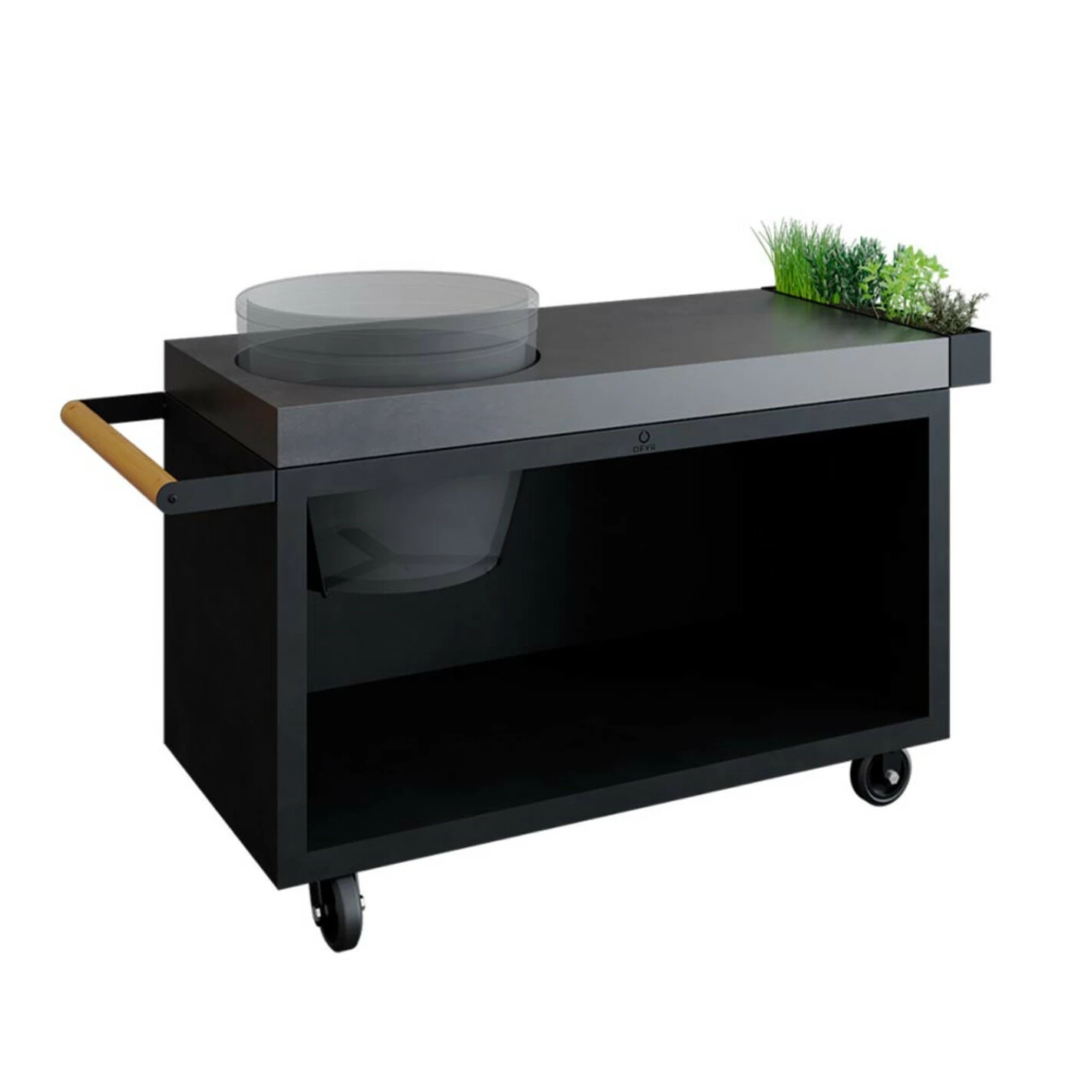 Aménagez une cuisine extérieure durable et minimaliste avec la table en acier laqué noir 135 PRO kamado : une table spécialement conçue pour encastrer votre barbecue The Bastard Large (Urban ou Classic).